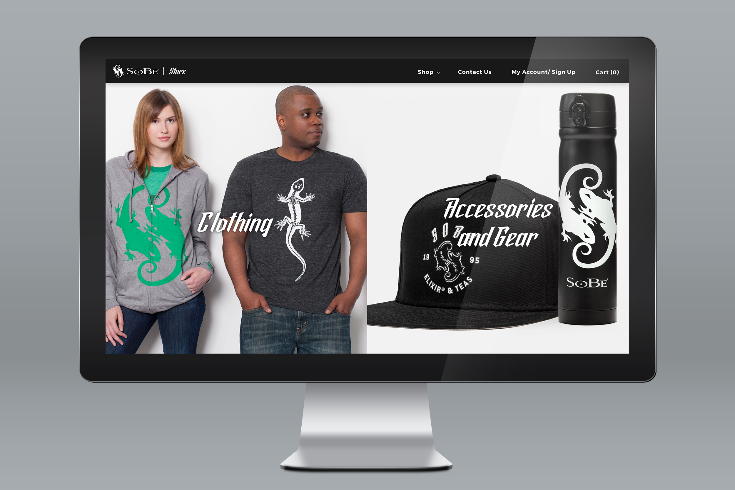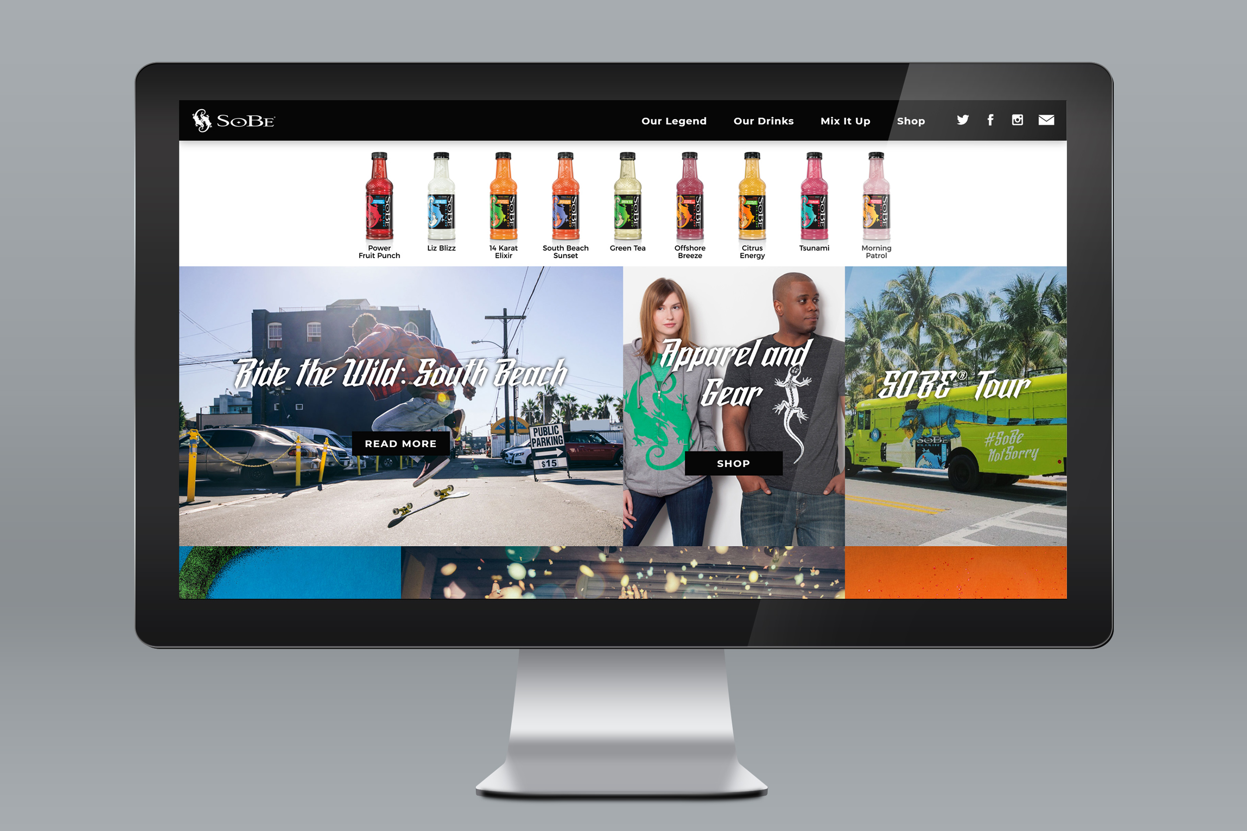 As part of the SoBe identity overhaul, we determined that merchandise sales would be critical in keeping fans engaged with the brand and returning to the site. Beezoo designed a line of brand apparel, and built a SoBe ecommerce site as a custom Shopify template, using the same layout and styling as the brand site. This maintained a seamless user experience as visitors moved between Sobe.com and Shopify.